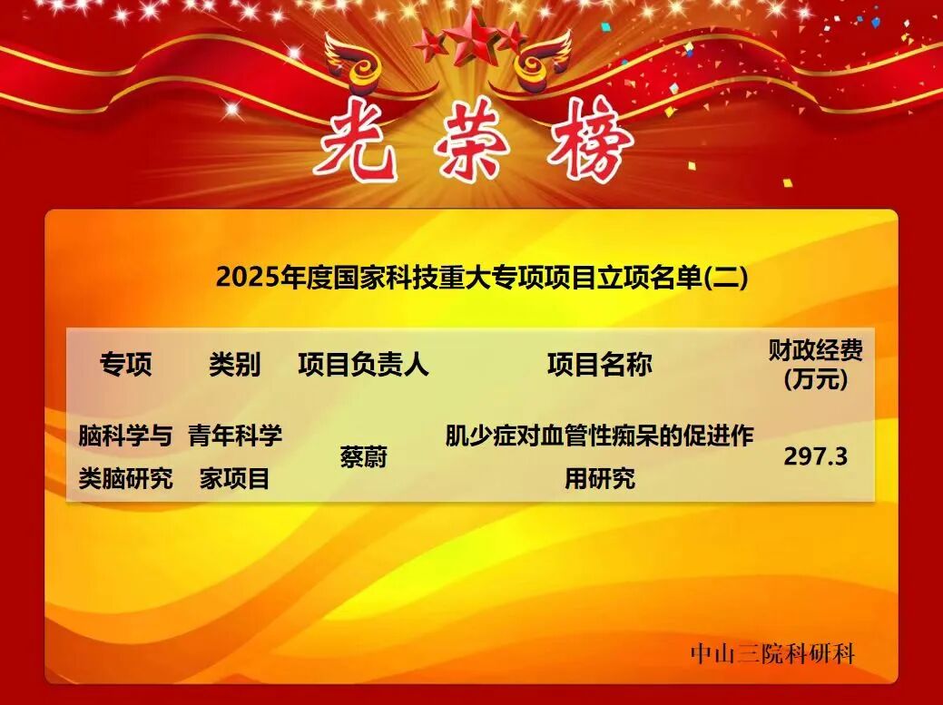 Recently, the National Natural Science Foundation of China announced the list of projects funded under the 2025 National "Brain Science and Brain-Like Research" Major Science and Technology Program. The project "Study on the Promoting Effect of Sarcopenia on Vascular Dementia," organized and submitted by Associate Researcher Cai Wei from The Third Affiliated Hospital of Sun Yat-sen University, has been awarded a Young Scientist Project grant under this program. This project is jointly submitted by two institutions: The Third Affiliated Hospital of Sun Yat-sen University (the lead unit) and the School of Biomedical Engineering at Sun Yat-sen University.